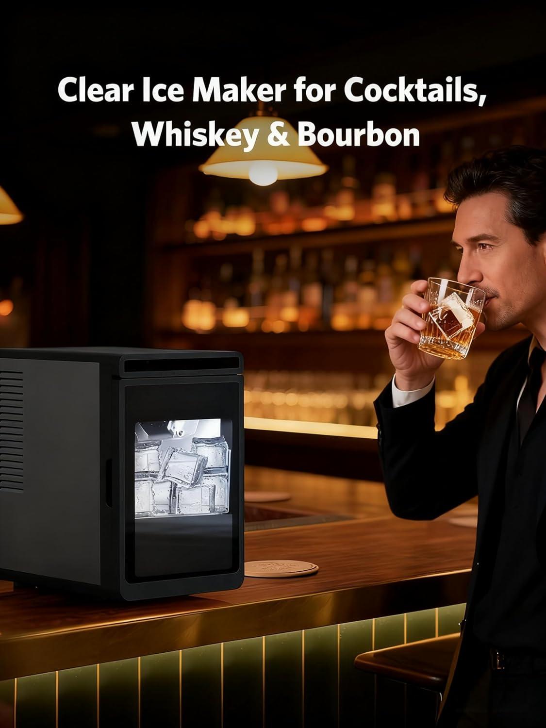【Clear, Slow-Melting Ice】 Get bar-quality cubes at home! This Large Cubic ice maker can produces three 1.6″ Crystal Clear Ice Cube in just 35 mins and approximately 26 lbs per day.The Slow Melting Cubic Ice can keepyour whiskey, cocktails, and beverages chilled with rich flavor