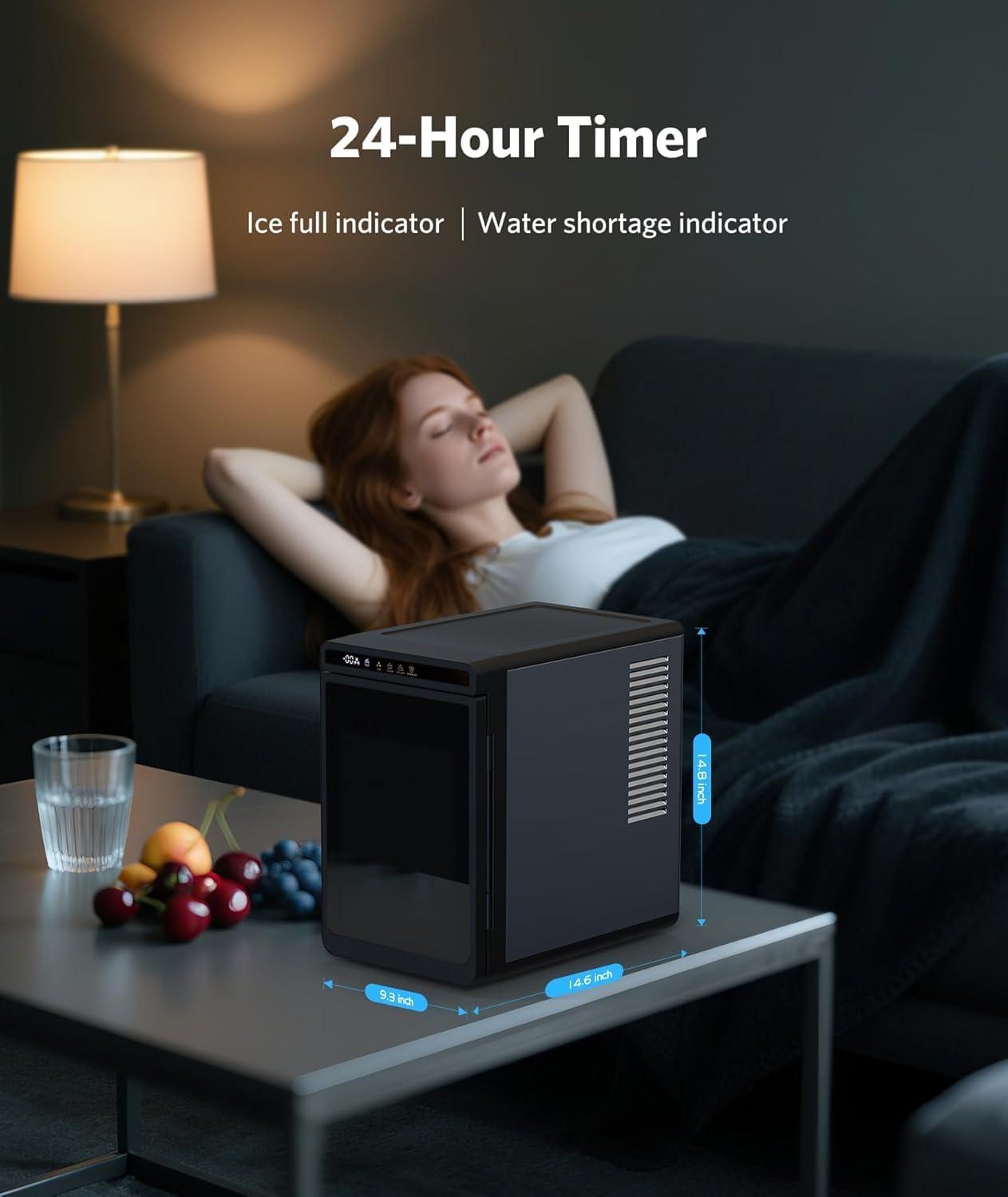 【24H Timer & Quiet Operation】With the 24-hour timer and one-touch ice making, you can freely schedule the ice making as you want.The clear ice maker operates at less than 43dB, ensuring it won't disrupt your sleep, work, or other daily activities
