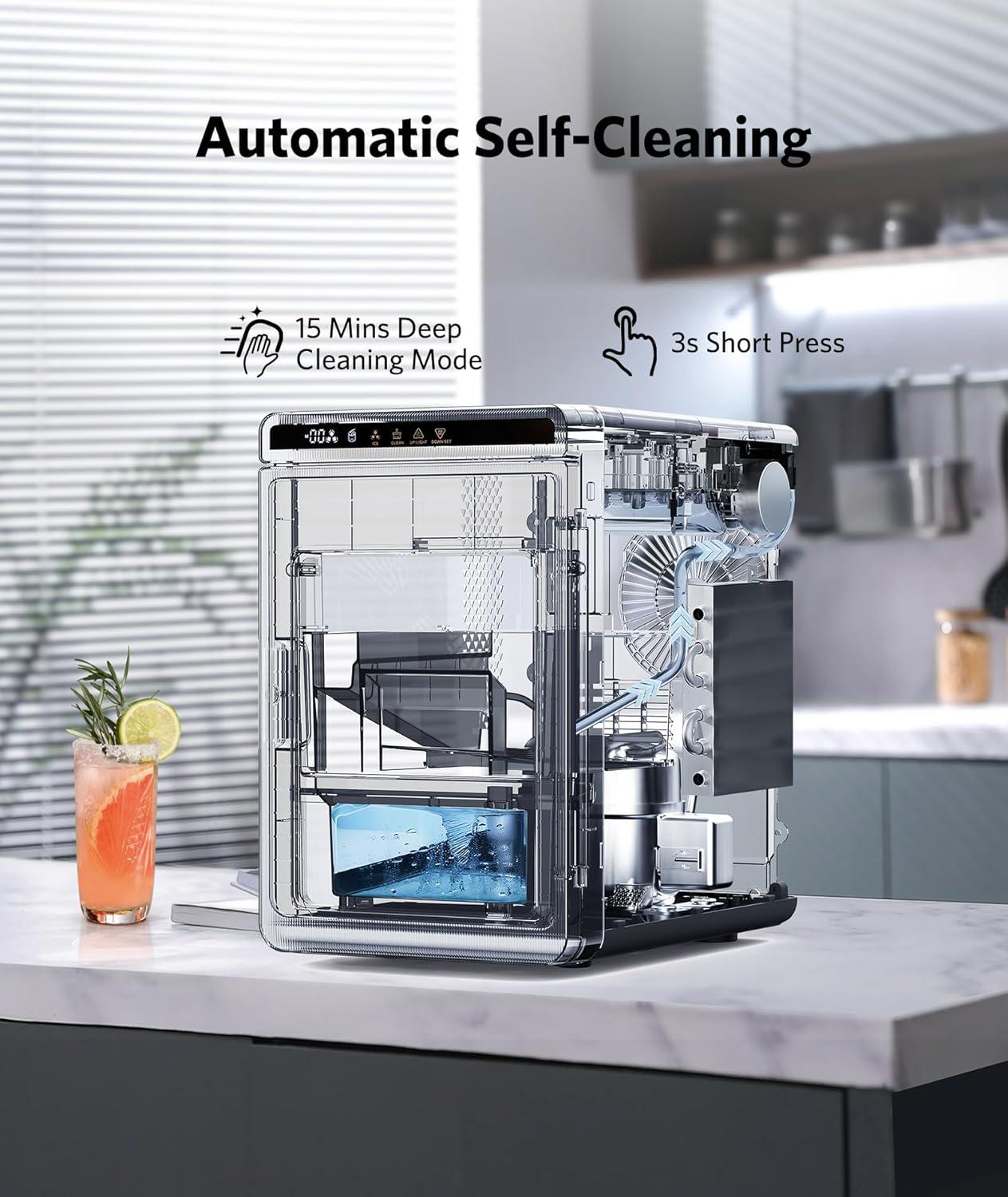 【Self-Cleaning Function】 Keep your ice pure with the one-touch self-cleaning mode. No scrubbing needed—just press a button, and the machine automatically removes scale and residue for fresh, clean ice every time