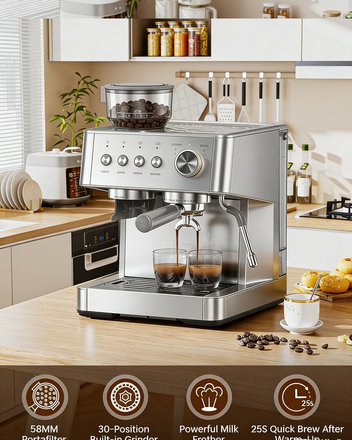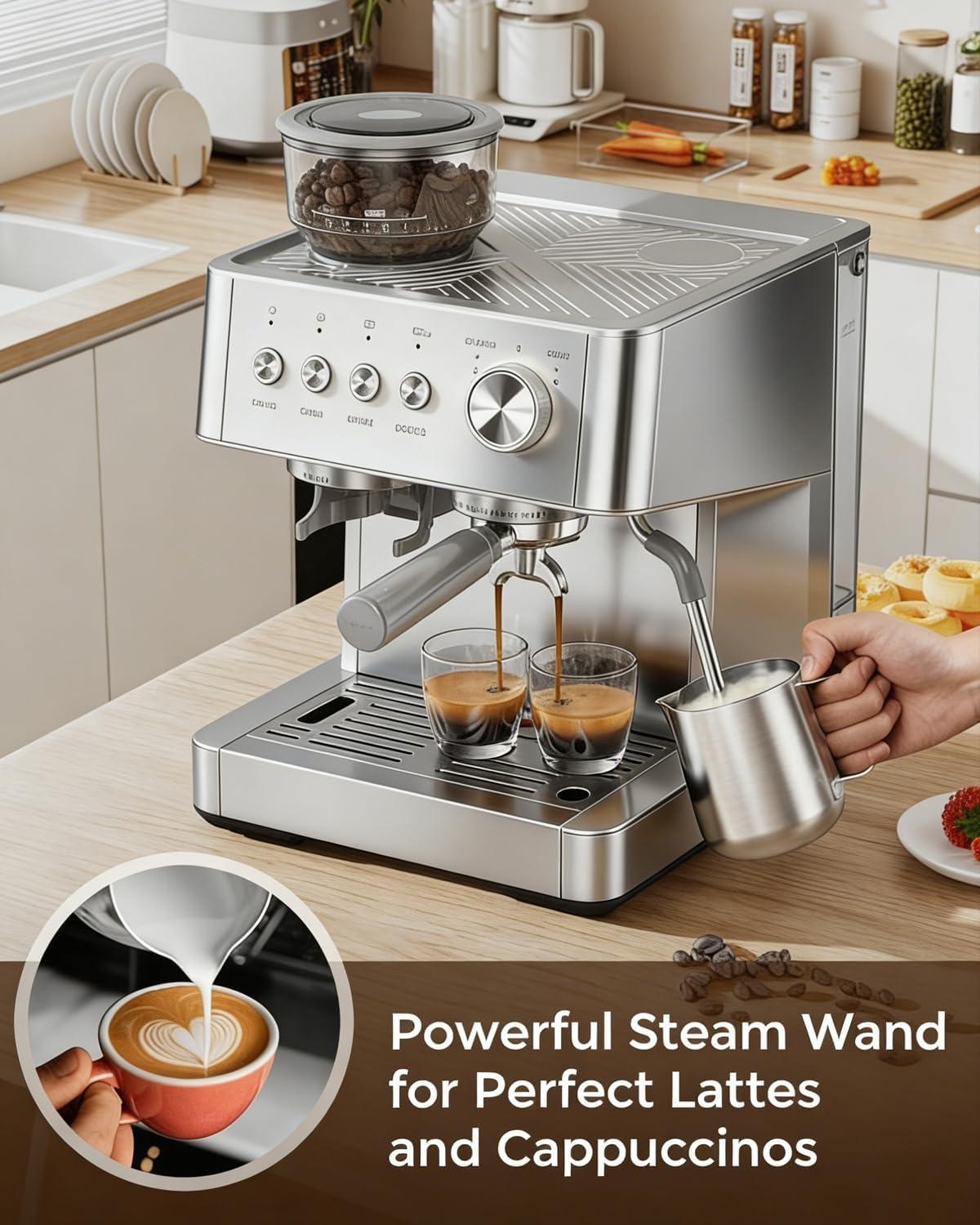 【IDEAL PRESSURE】Smoother espresso machine with grinder, 20 Bar Expresso Coffee Machines with Milk Frother Steam Wand, Extracting maximum flavor and aroma from every coffee ground. Enjoy café-quality depth and crema in every cup, just like your favorite barista makes!