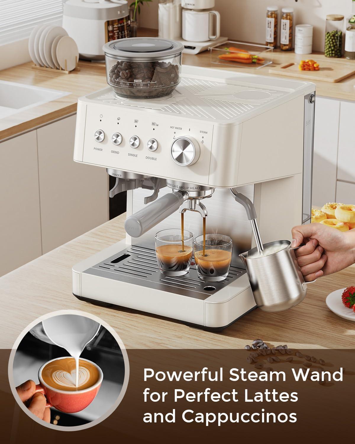 (2026 Upgrade) 15 Bar Espresso Machine with Built-in Anti-Clog Coffee Grinder, Expresso Coffee Machines with Milk Steam Wand/Frother/Tamping Tools,Espresso Maker with Grinder for Lattes-Almond(White)