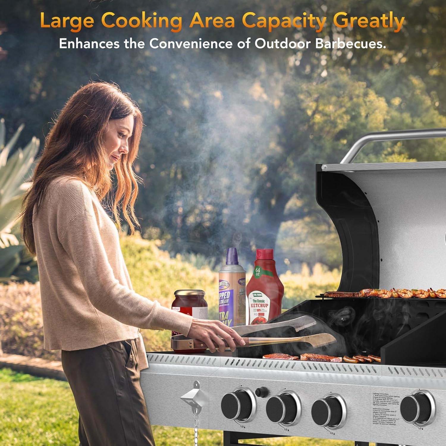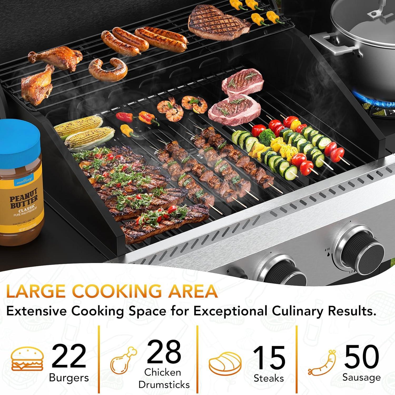 Large Cooking Area:The gas grill features a spacious 373 square inch grilling area and a 142 square inch warming area .offering plenty of room for grilling enthusiasts. Its design allows for simultaneous cooking of various foods, making it ideal for BBQ parties with friends and family.Whether you're grilling burgers, kabobs, or veggies, this gas grill is designed to elevate your outdoor cooking experience