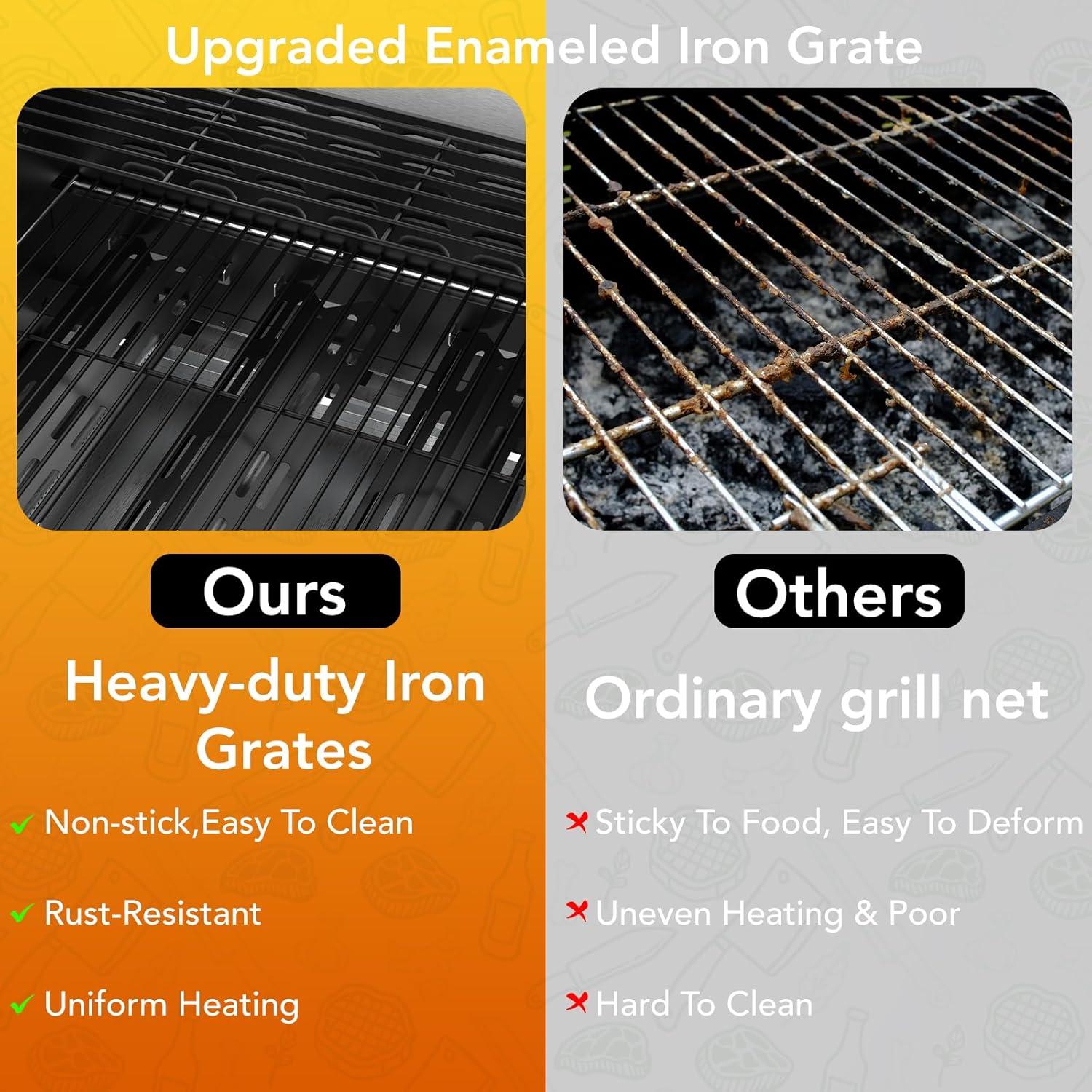 High-Quality Materials: The main part of the outdoor grill is made of high-quality stainless steel, which makes it very strong and durable. The grate is upgraded to porcelain-enameled cast iron, which combines the advantages of traditional cast iron and enameled grates such as durability, non-stick, rust-proof and crack-proof.grill for all seasons