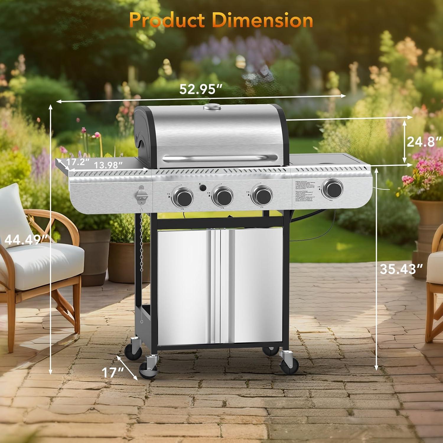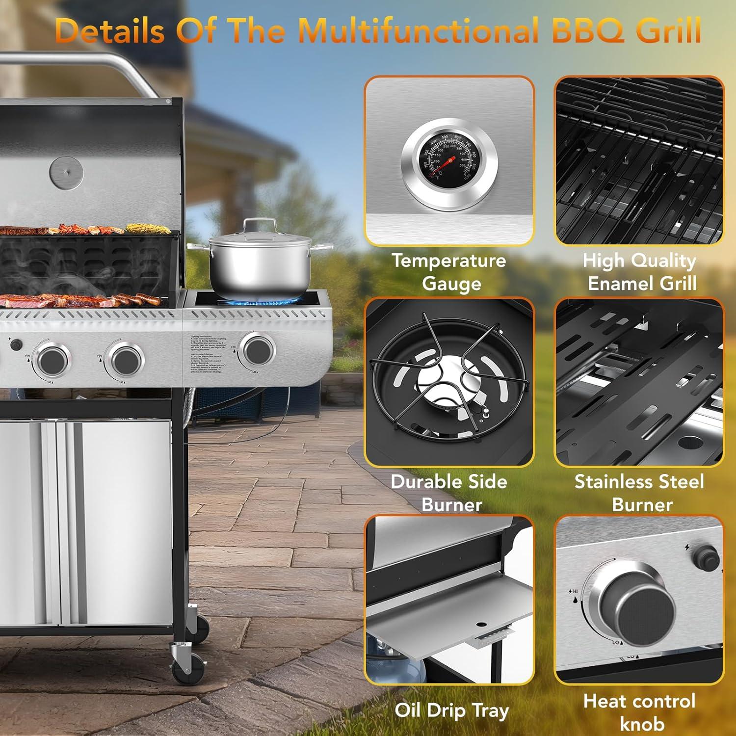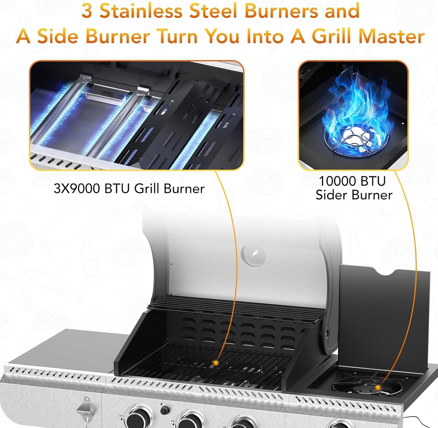 3-Burner Propane Gas Grill with Side Burner,Stainless Steel BBQ Grill with Porcelain-Enameled Cast Iron Grates,37000 BTU Barbecue Grill, Suitable for Patio,Camping,Outdoor Cooking(4-Burner Grills)