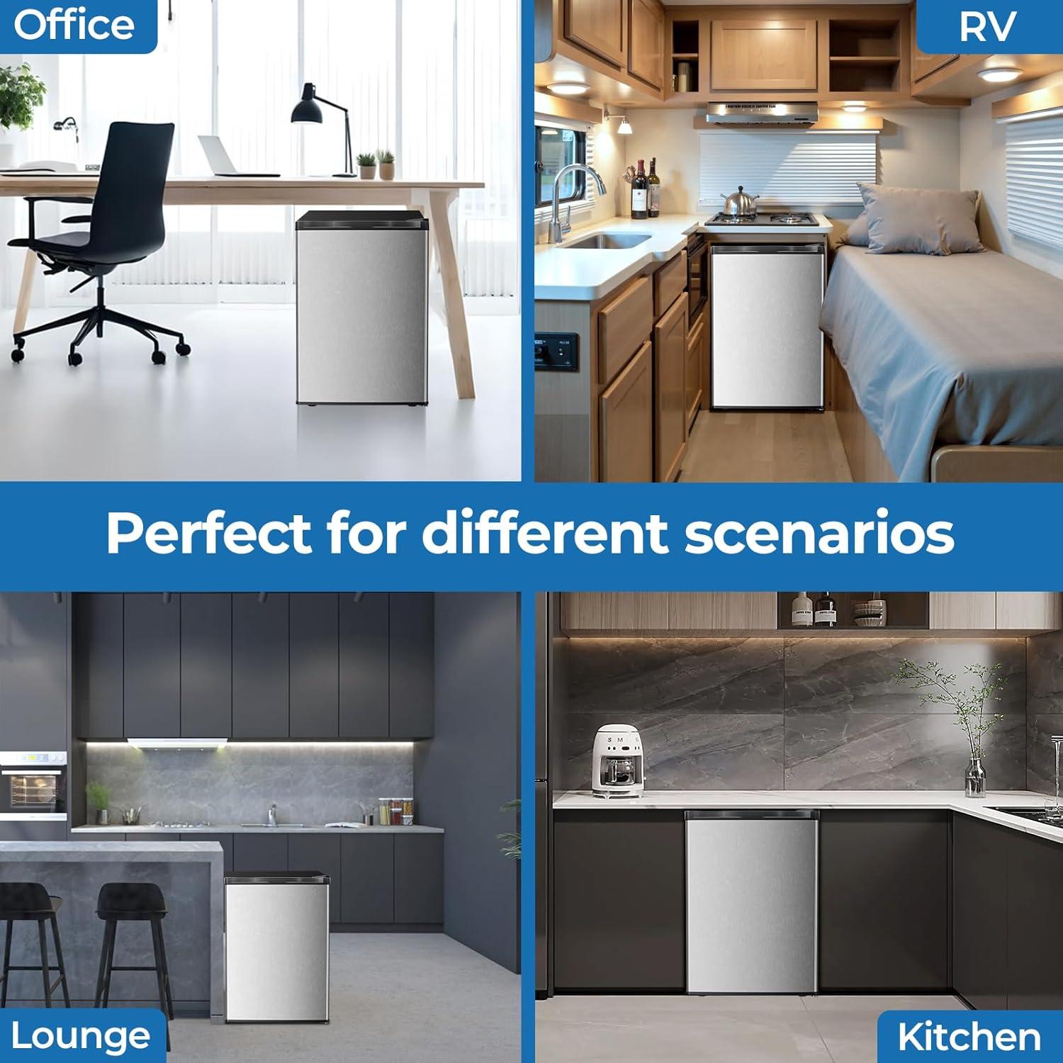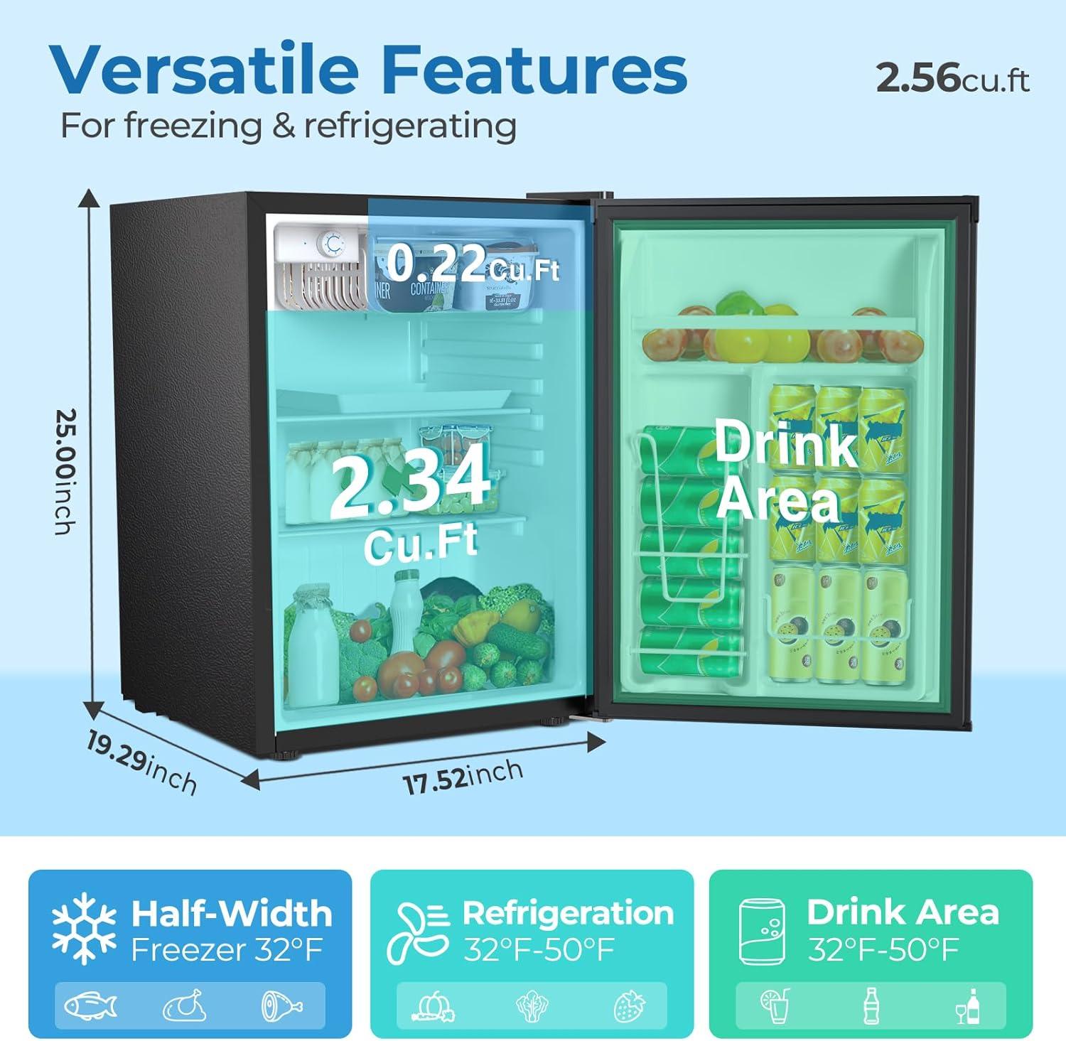 The mini fridge dimensions of 25in(H)*19.29in(D)*17.52inch(W). It requires very little space and is perfect for apartments, dorms, offices, and bedrooms. Reversible doors offer great flexibility in limited spaces.