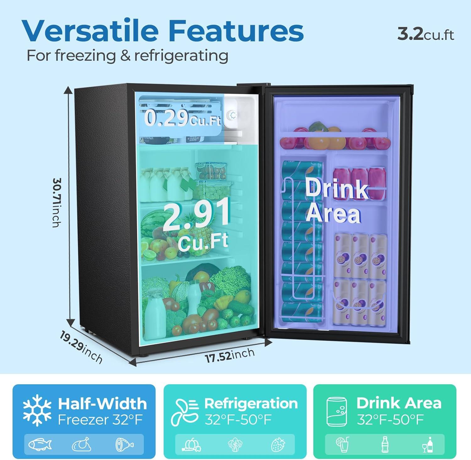 The Mini Refrigerator has a rotary thermostat button inside. The freezer has a temperature range of 30°F to 48°F (-1°C to 8°C not suitable for storing ice cream) and the fridge offers 7 variable temperature settings depending on your needs. Includes a compact freezer that allows you to make ice cubes, and keep food fresh and drinks chilled.