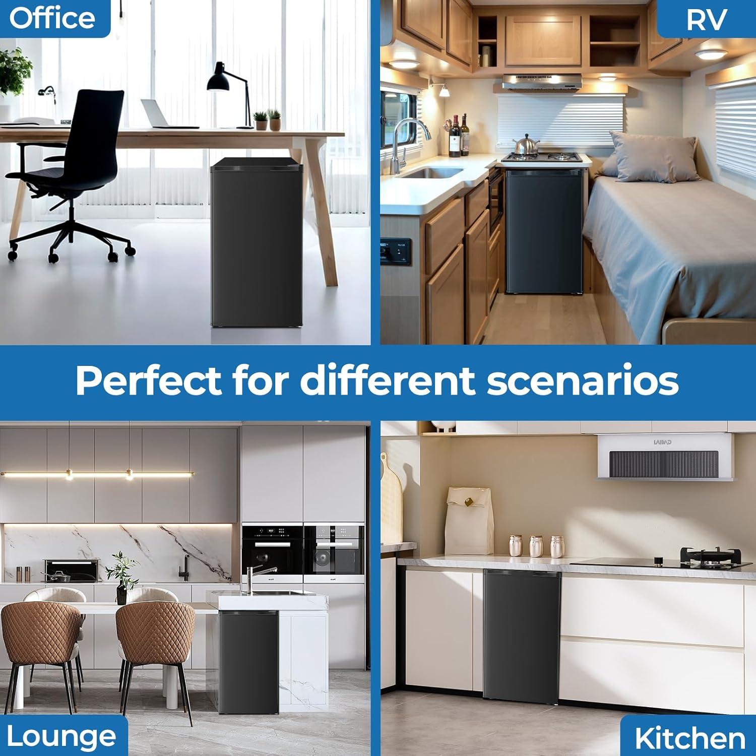 The mini fridge dimensions of 31.5in(H)*21.65in (D)*20.28in (W). It requires very little space and is perfect for apartments, dorms, offices, and bedrooms. Reversible doors offer great flexibility in limited spaces.