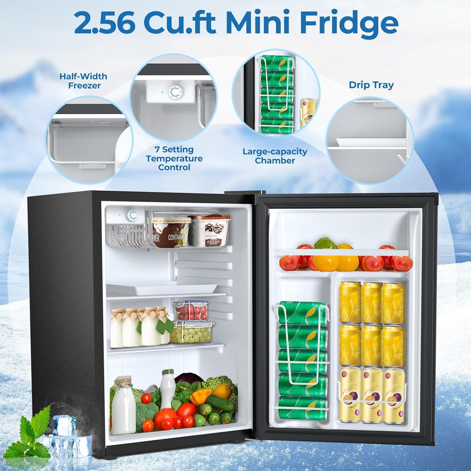 The Mini Refrigerator has a rotary thermostat button inside. The freezer has a temperature range of 30°F to 48°F (-1°C to 8°C not suitable for storing ice cream) and the fridge offers 7 variable temperature settings depending on your needs. Includes a compact freezer that allows you to make ice cubes, and keep food fresh and drinks chilled.