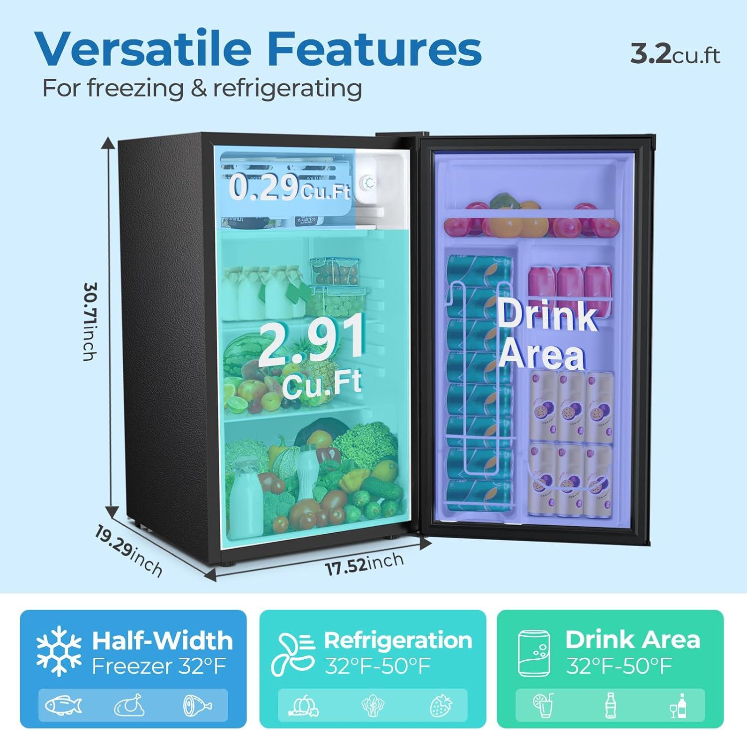 The mini fridge dimensions of 31.5in(H)*21.65in (D)*20.28in (W). It requires very little space and is perfect for apartments, dorms, offices, and bedrooms. Reversible doors offer great flexibility in limited spaces.