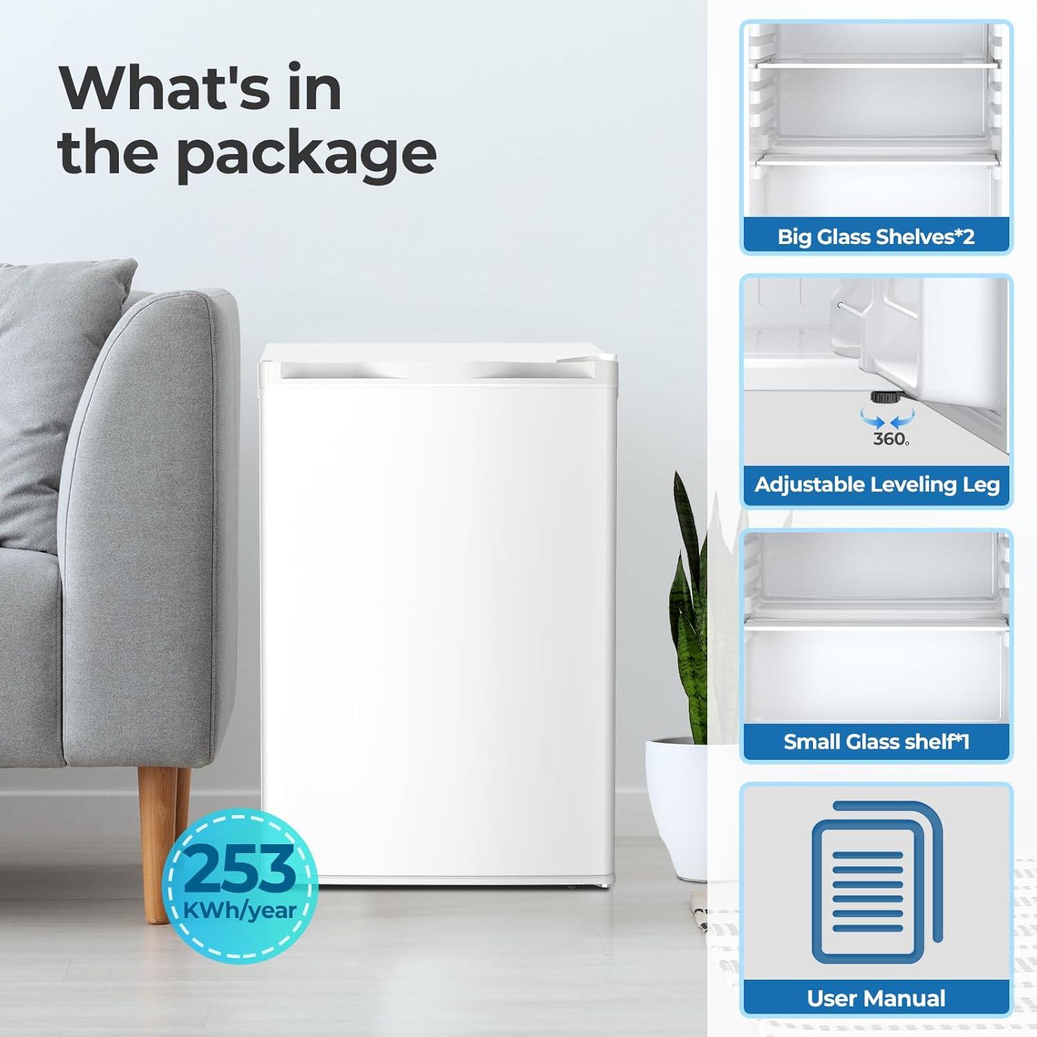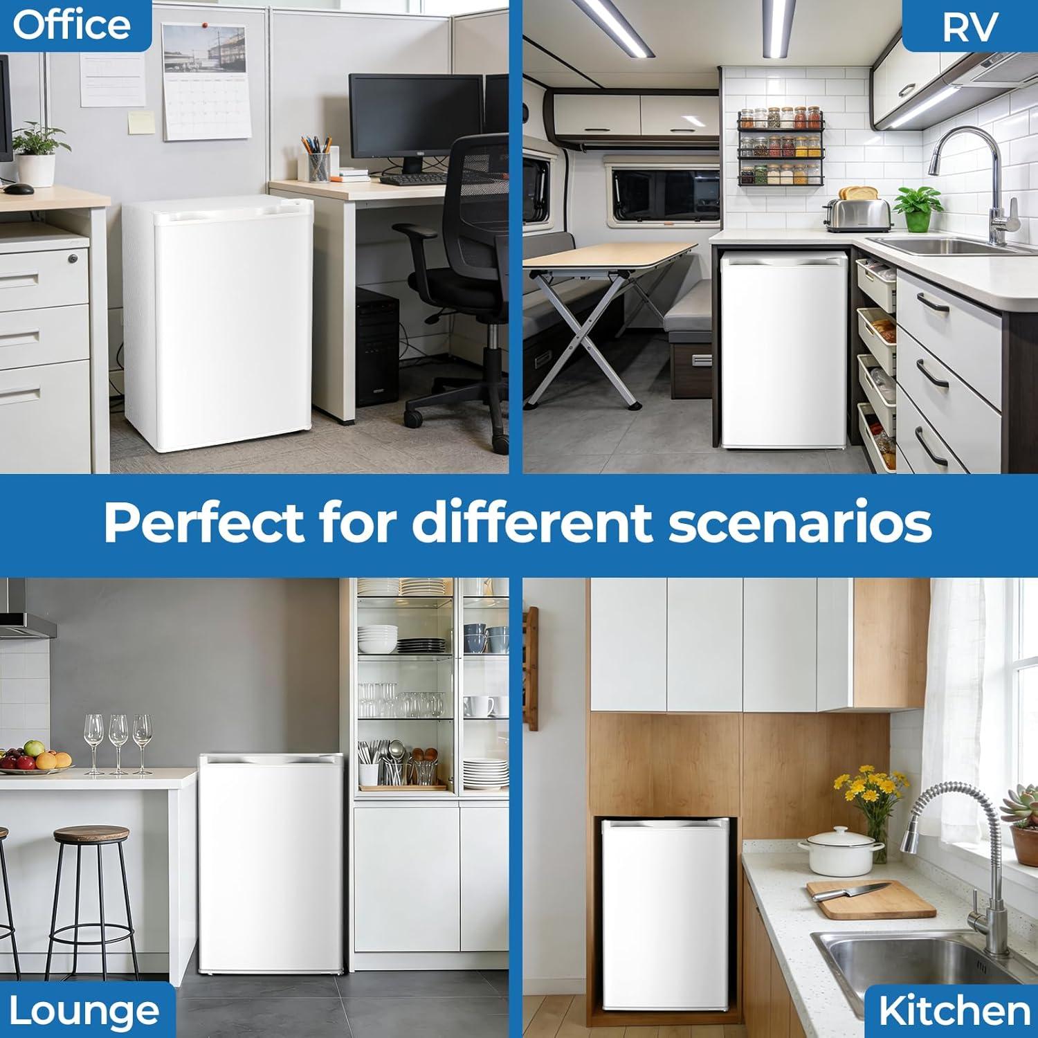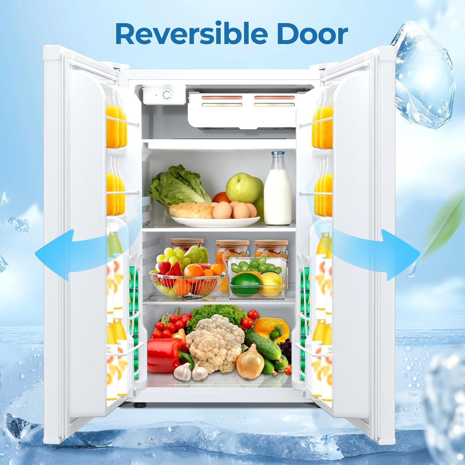The mini fridge dimensions of 31.5in(H)*21.65in (D)*20.28in (W). It requires very little space and is perfect for apartments, dorms, offices, and bedrooms. Reversible doors offer great flexibility in limited spaces.