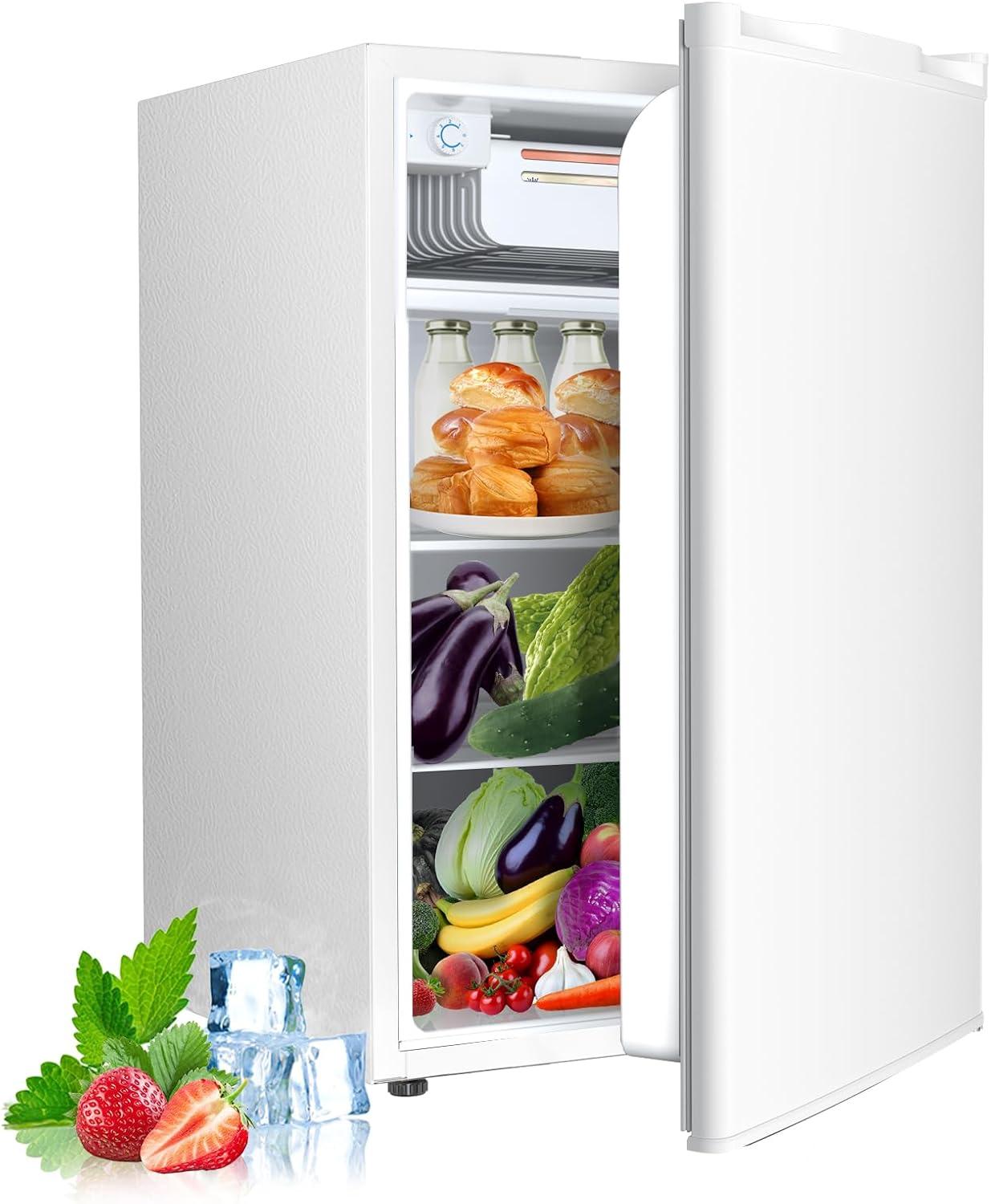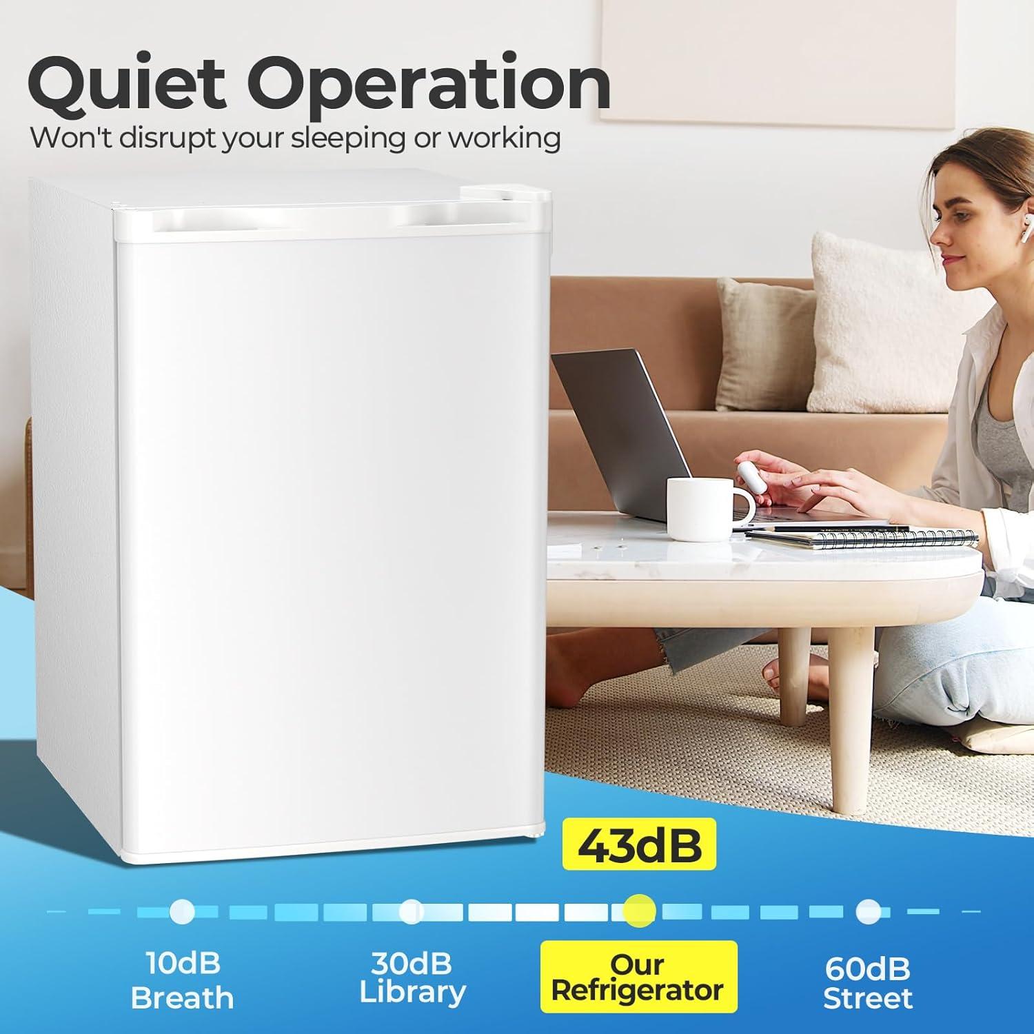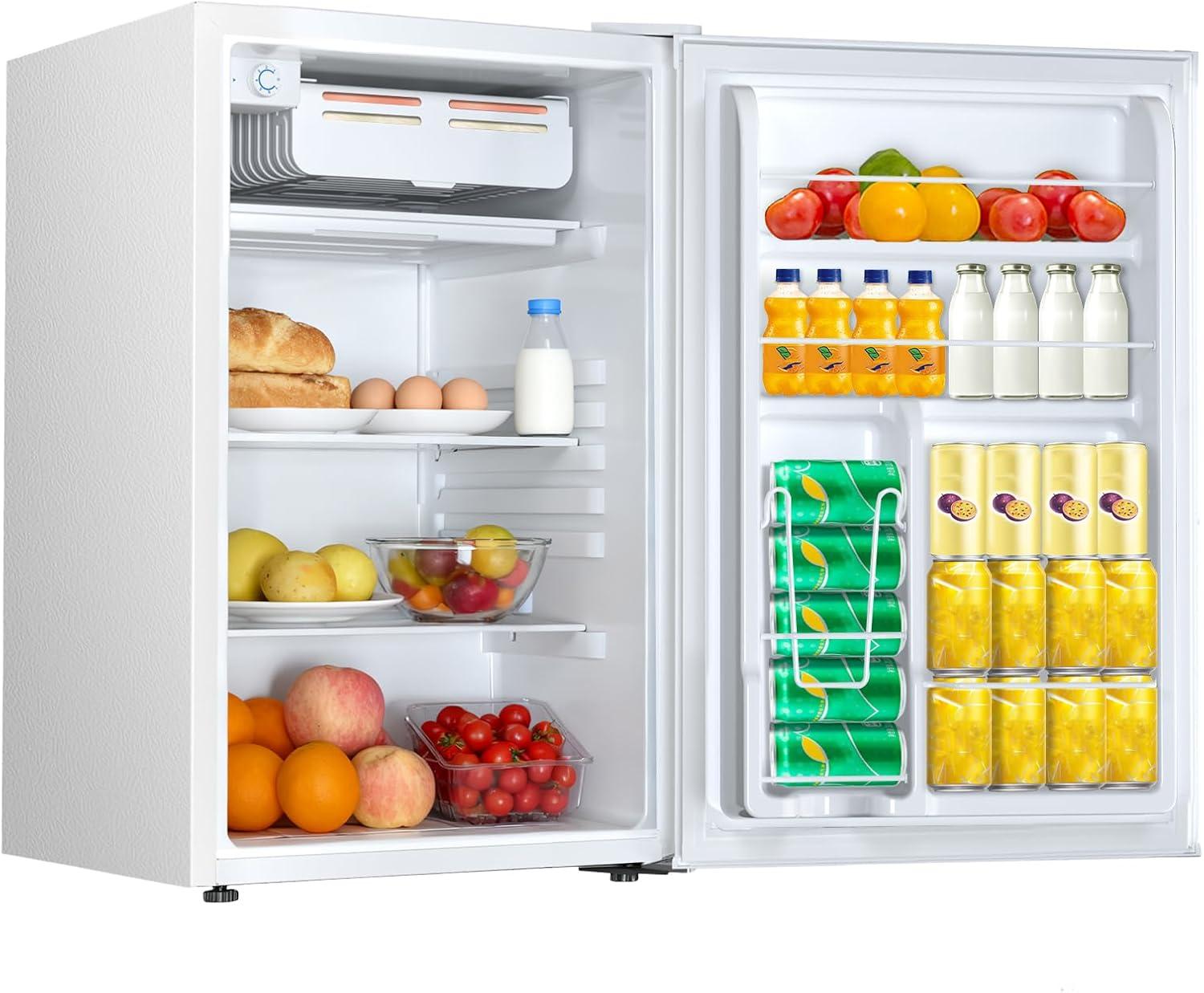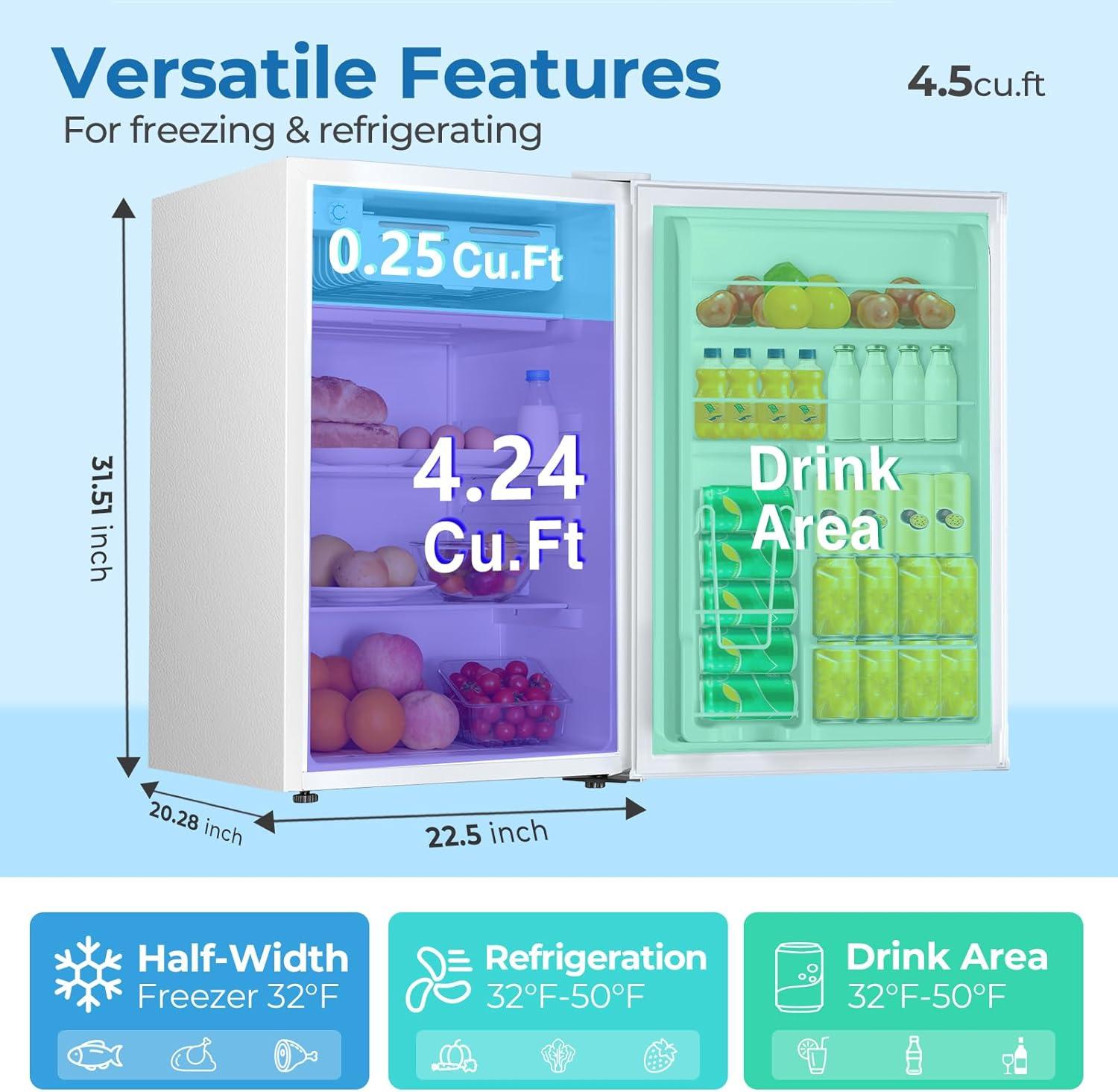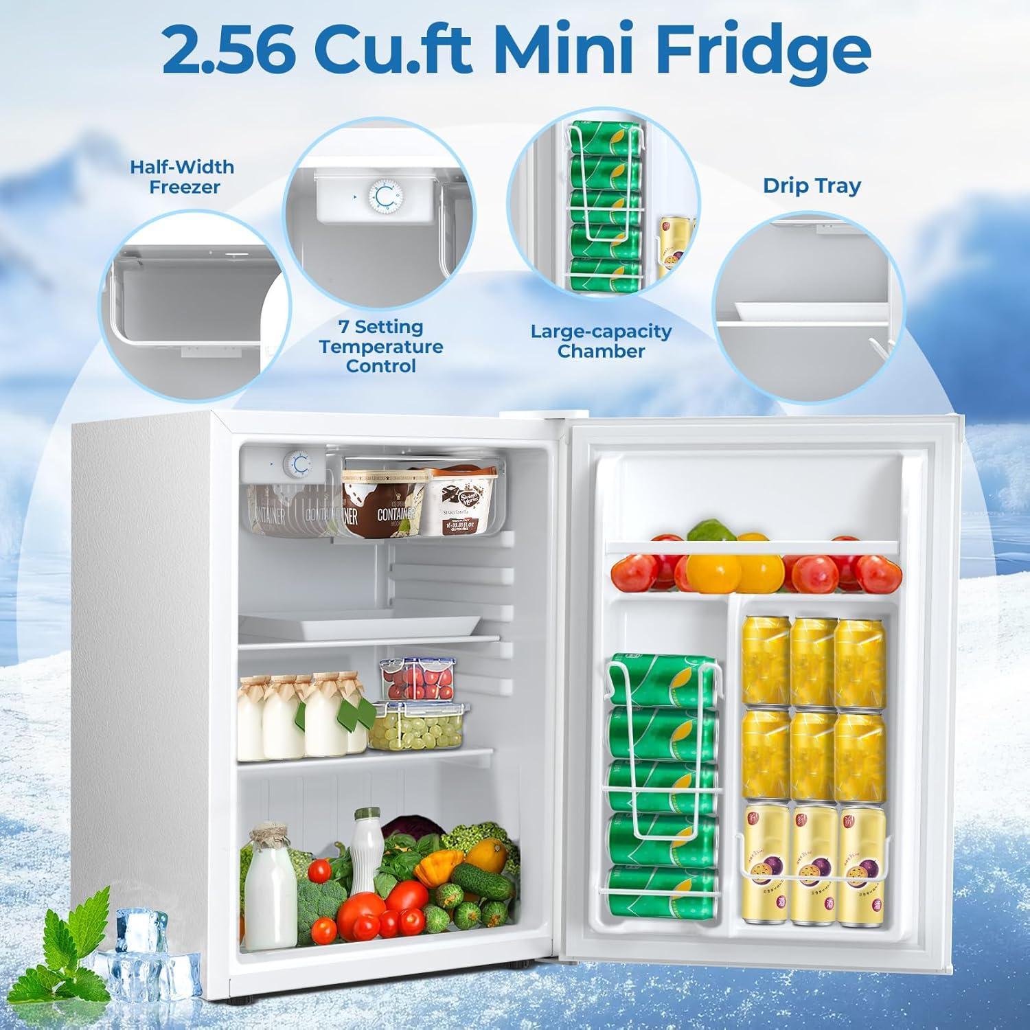 The Mini Refrigerator has a rotary thermostat button inside. The freezer has a temperature range of 30°F to 48°F (-1°C to 8°C not suitable for storing ice cream) and the fridge offers 7 variable temperature settings depending on your needs. Includes a compact freezer that allows you to make ice cubes, and keep food fresh and drinks chilled.