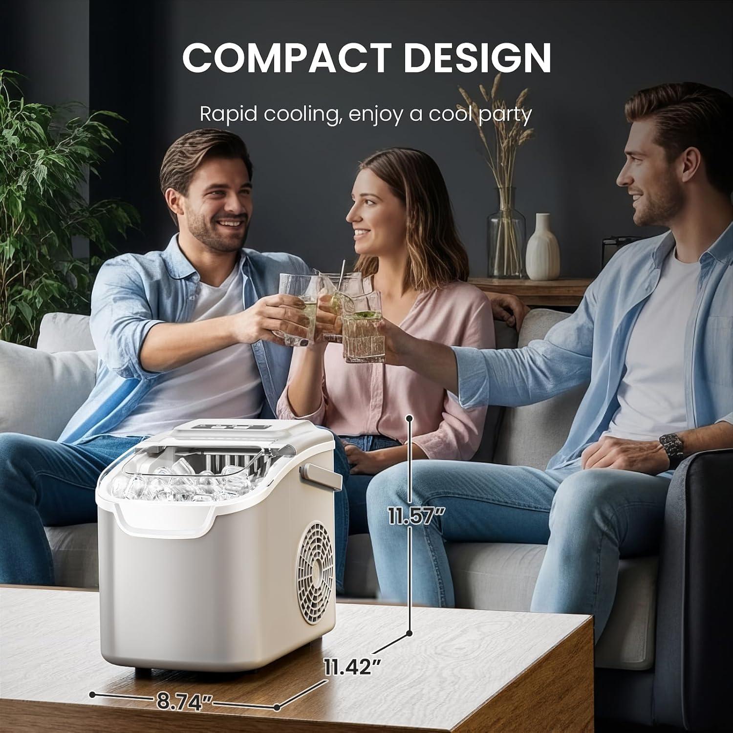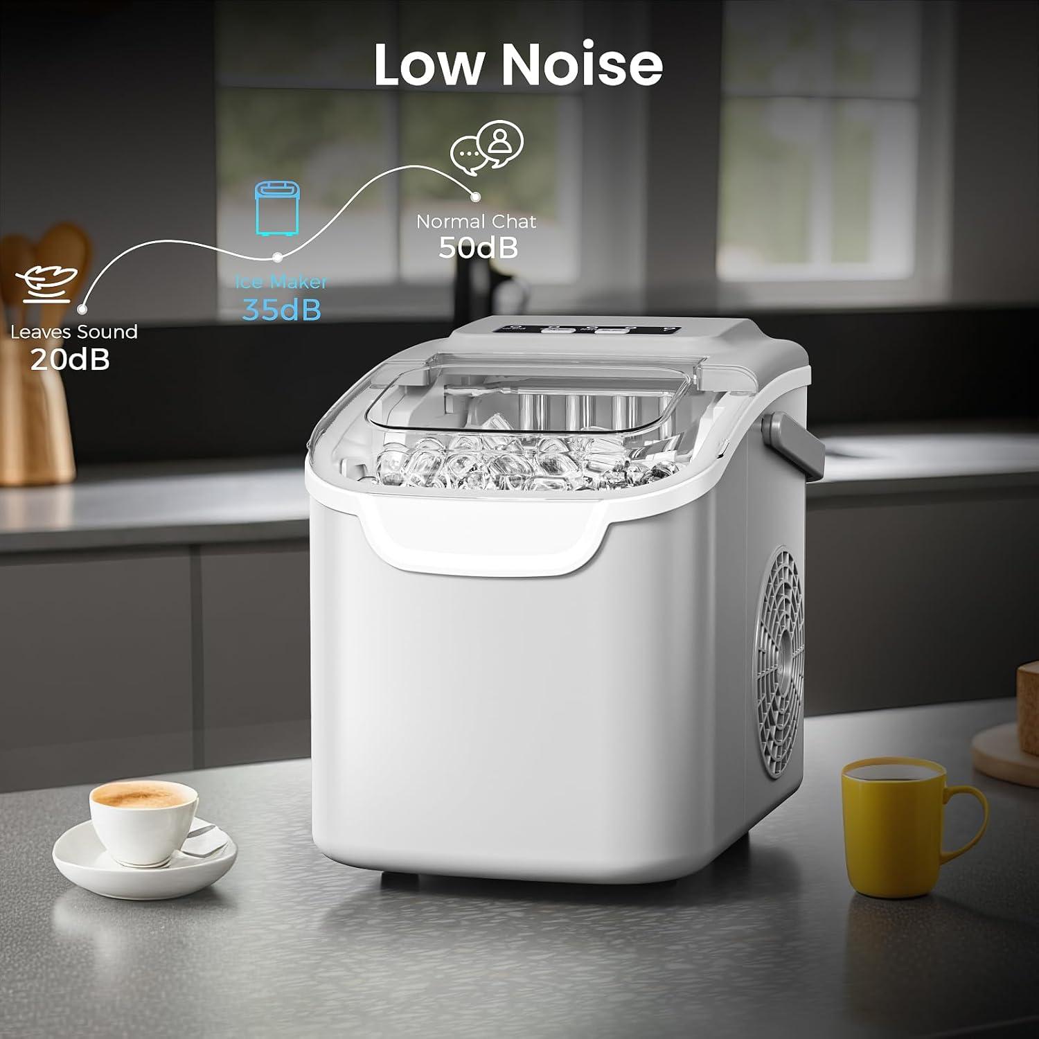 High-Efficiency Production:Compact ice machine generates 8 fresh bullets per 6-12 minute cycle (26.5lbs/24hrs) with whisper-quiet operation, featuring visible water window and overflow protection.
