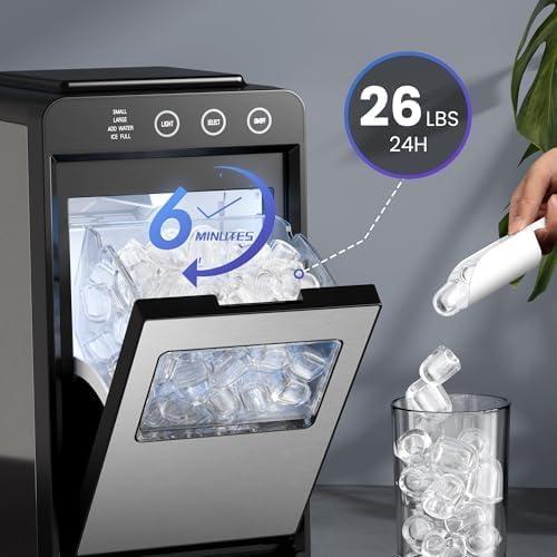 Ultra-Fast Ice Making: 8 Cubes in 6 Mins, 26Lbs/24H​ – Powerful compressor boosts efficiency—get 8 refreshing ice cubes in just 6 minutes! 0.8L water tank supports up to 26 lbs of ice per day, meeting demands for parties, office gatherings, or family meals—never run out of ice.
