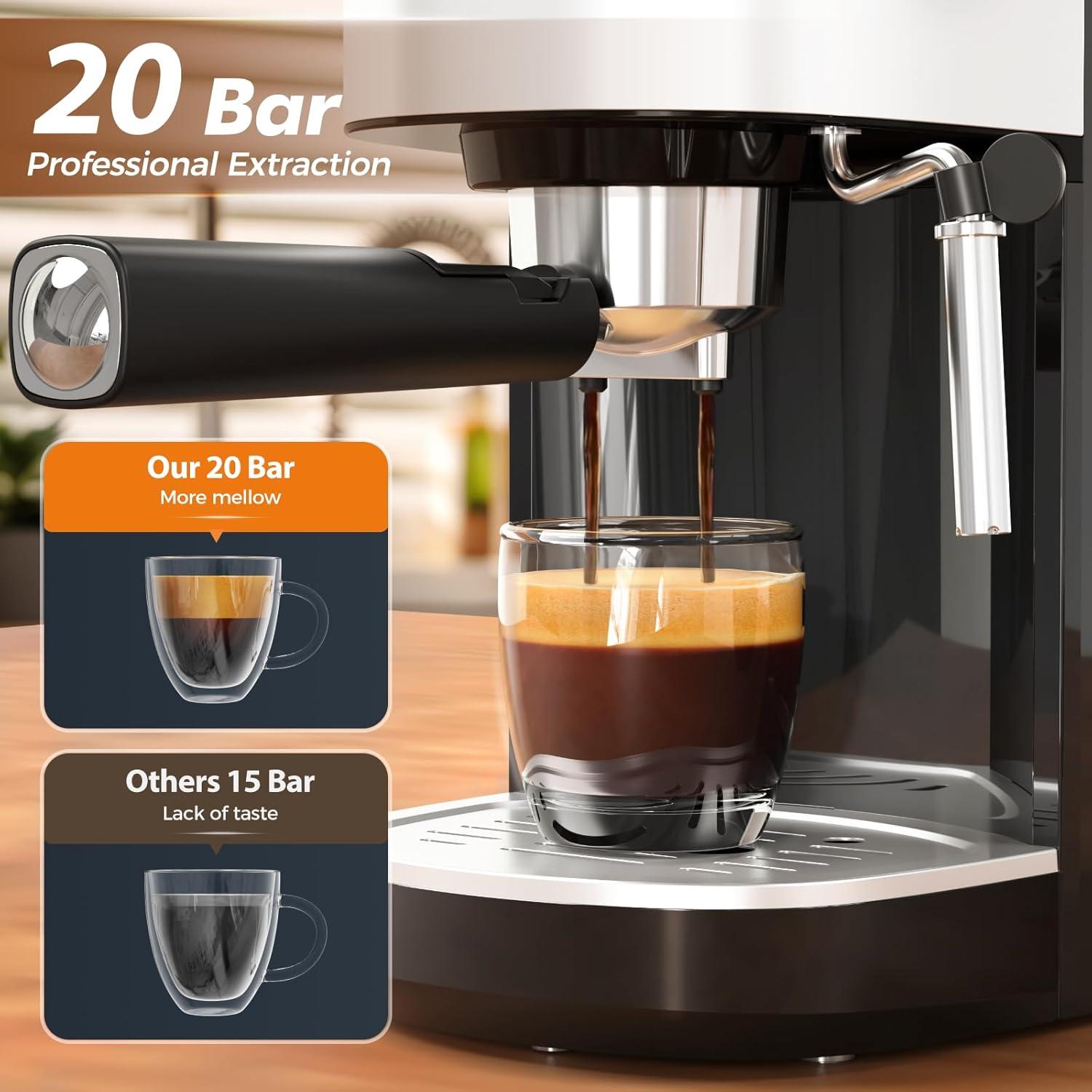 【20 Bar Professional Pressure】- Our espresso machine delivers rich espresso with crema using 20-bar high-pressure extraction. Perfect for making espresso, cappuccino, or latte with barista-style results.