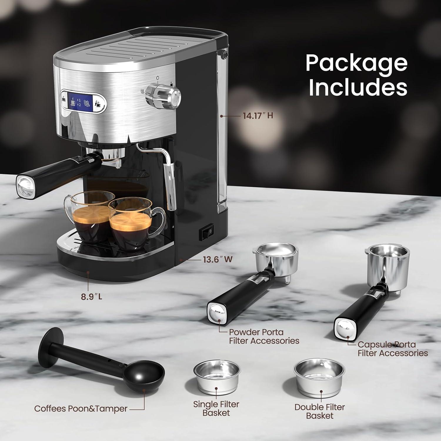 Espresso Machine 20 Bar, Professional Stainless Steel Coffee Maker with LCD Display, Steam Wand, 45oz Removable Water Tank, for Espresso, Cappuccino, Latte at Home or Office, Black(Black)