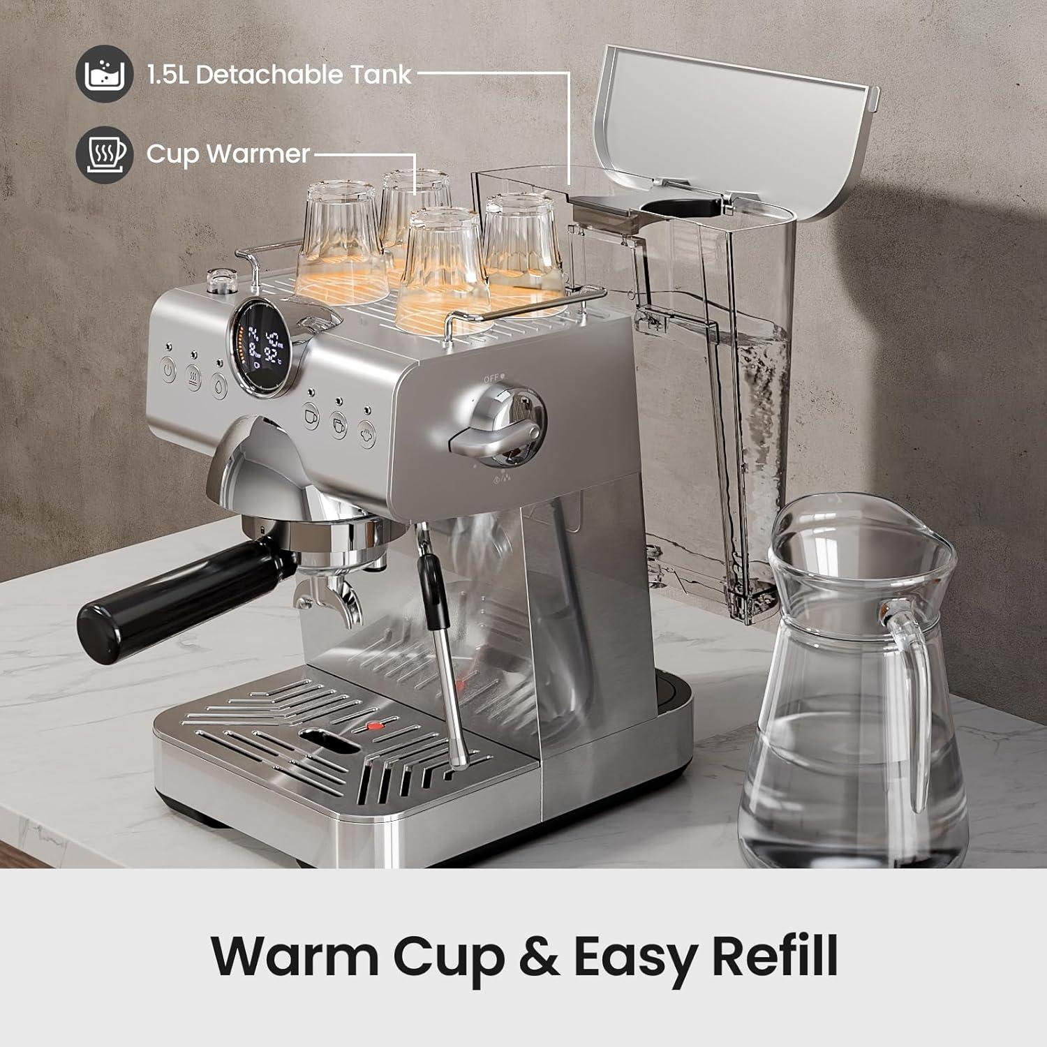 【Practical & Easy-Clean】The 1.5L removable tank, cup warmer, and easy-clean parts make this cafetera espresso ideal for daily use—compact, modern, and built for your routine.