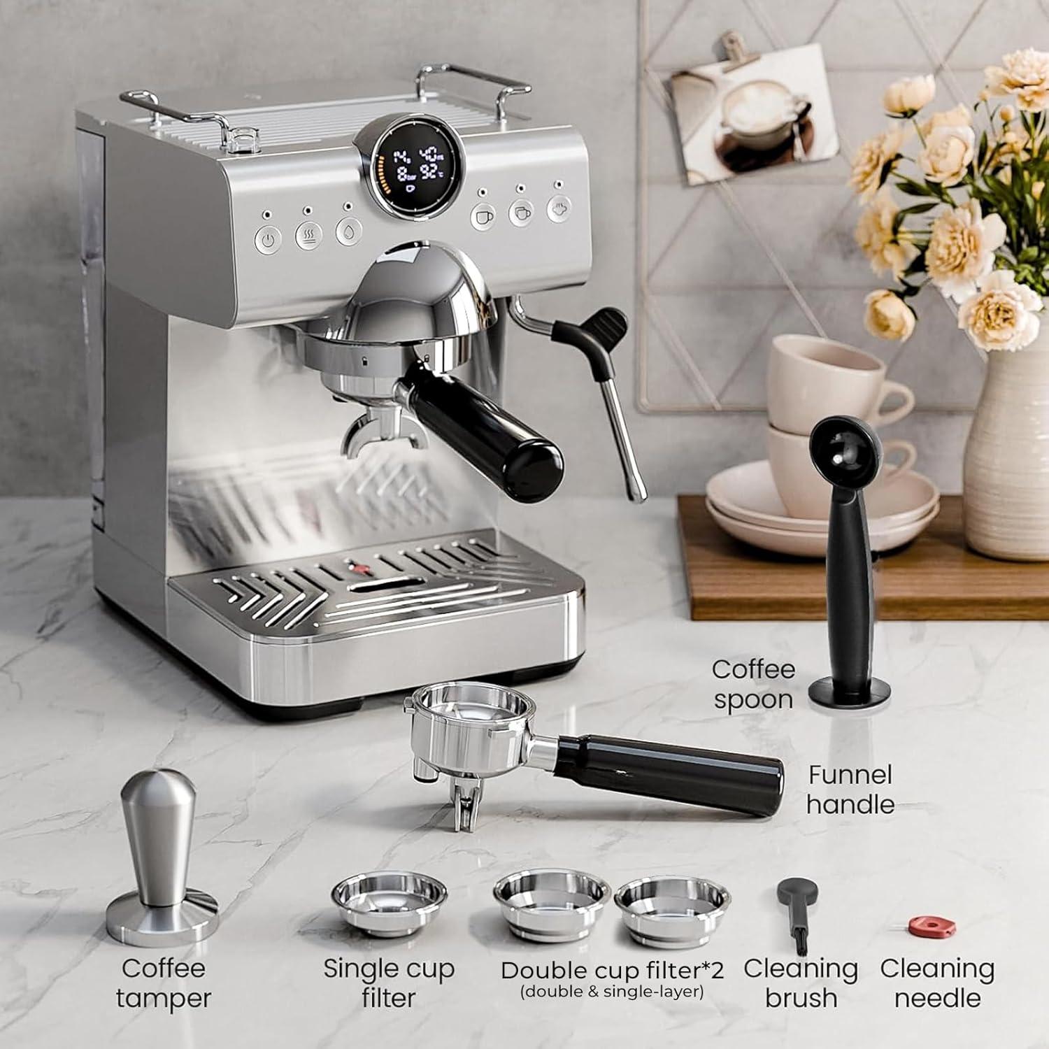 【Smart LED Display】Electactic espresso machine features a digital display showing brew time, pressure, and temperature. One-touch icons and single/double cup design.