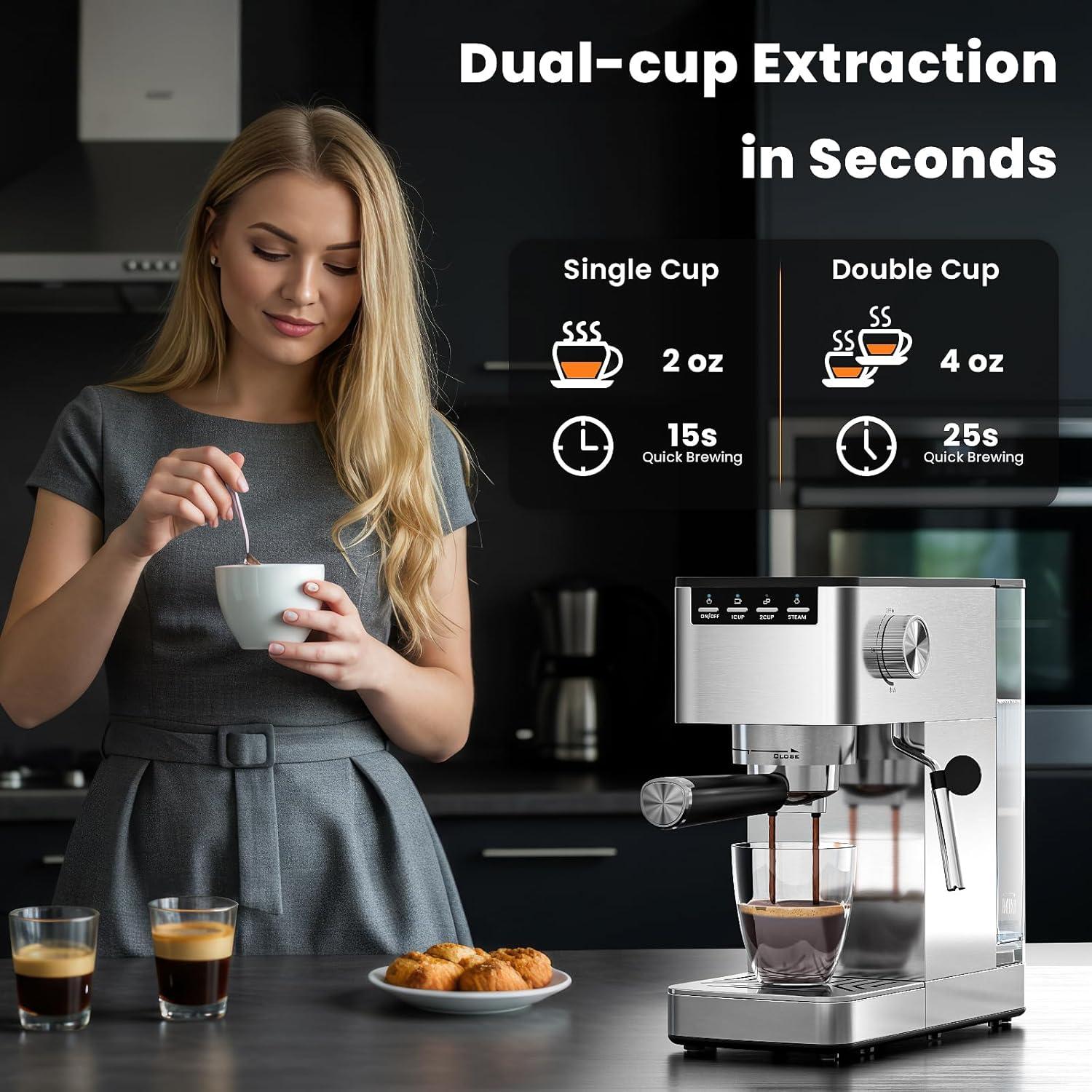 Quiet Operation with Safety Protection: Engineered for tranquil mornings, this espresso machine operates with minimal noise thanks to advanced noise reduction technology. It’s designed with built-in overheating and over-pressure protection, ensuring both a peaceful brewing experience and safe, reliable operation for your household