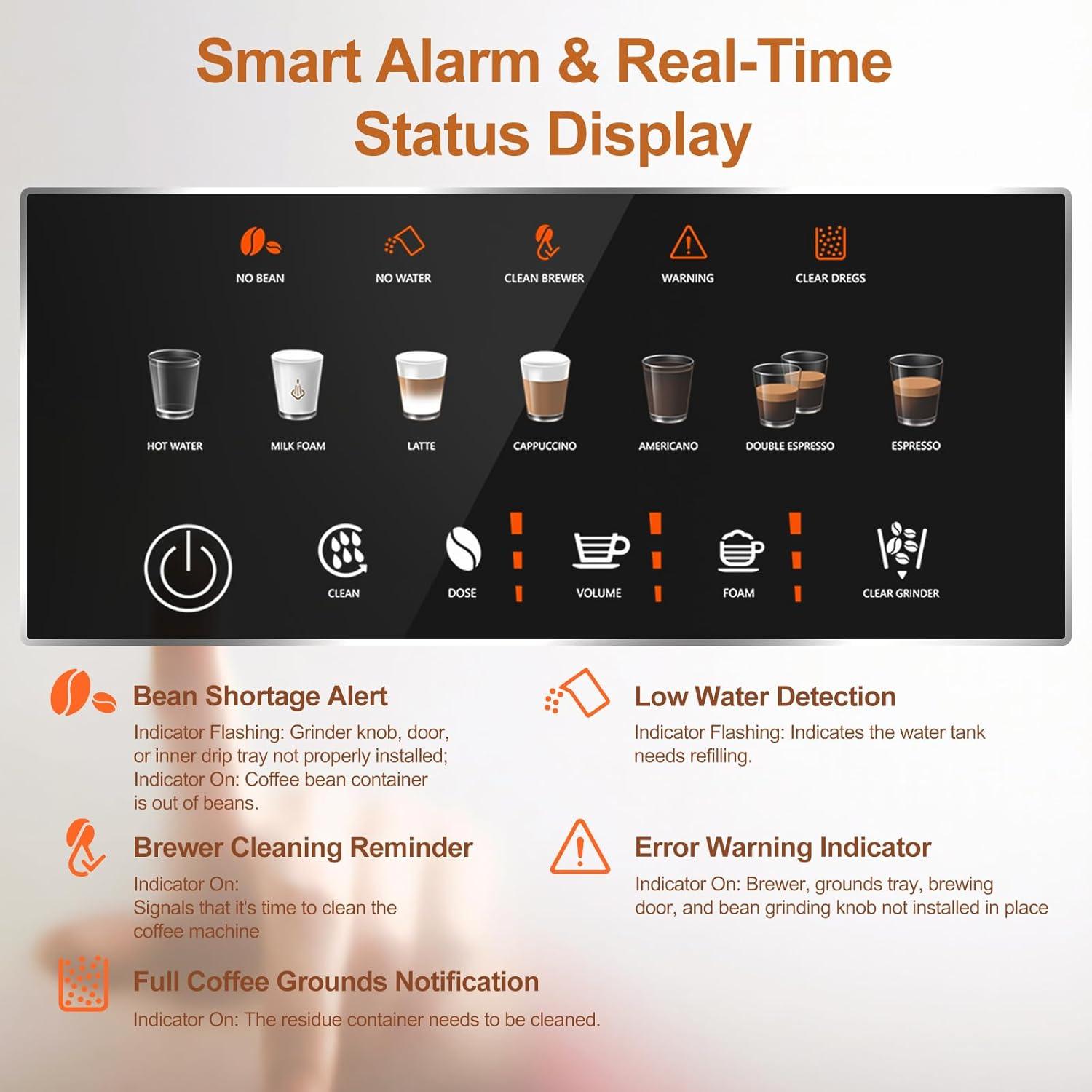 Fully Automatic Espresso Machine with Auto Milk Frother & Built-in Grinder, Smart Alarm, Coffee Machine with Intuitive Touchscreen & Auto-Clean Function, Ideal for Latte, Cappuccino, Americano