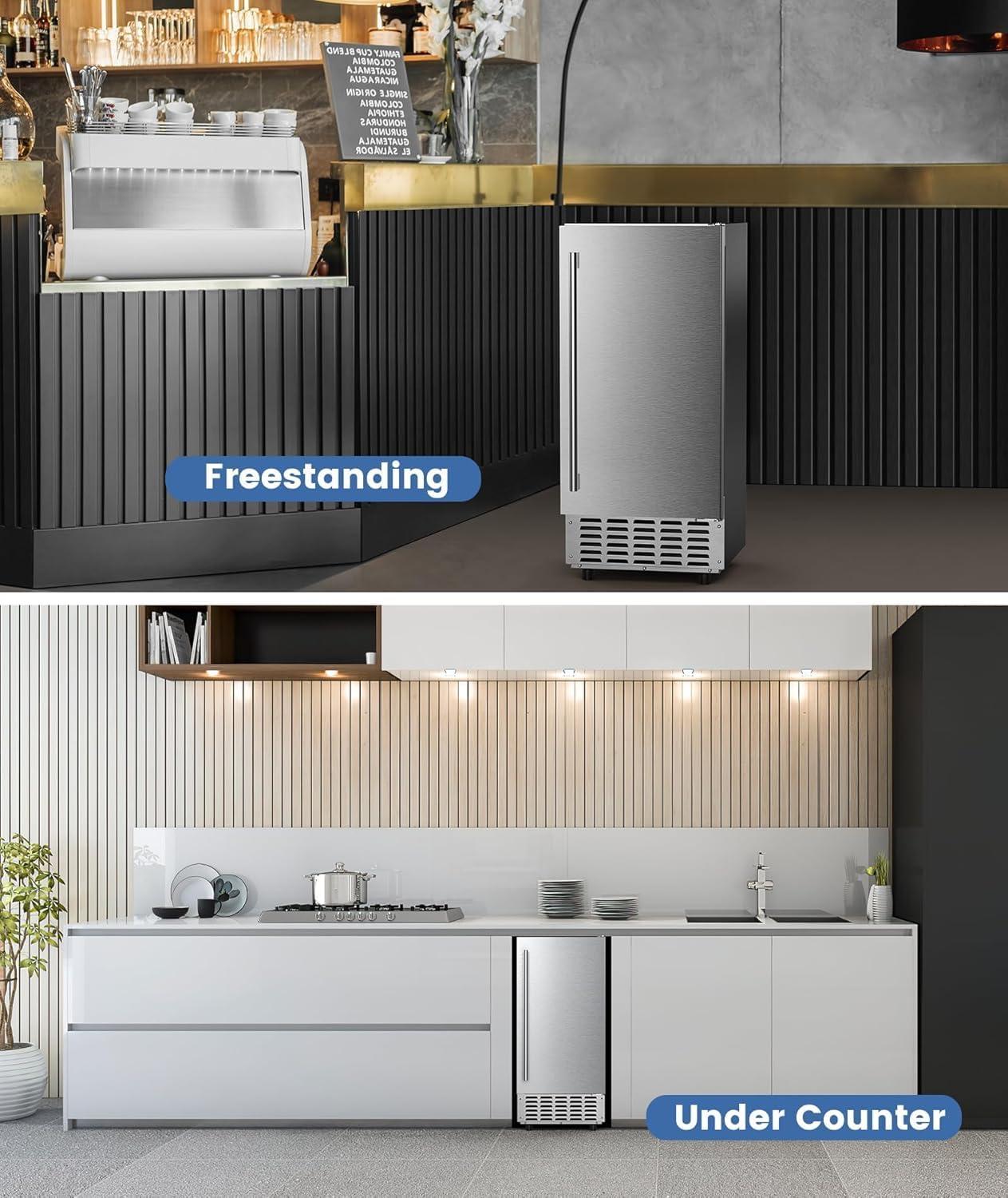 Built-in & Freestanding Design:This flexible under counter nugget ice maker can be installed as a built-in unit or used freestanding. Featuring a stainless steel door, it fits seamlessly into various settings while ensuring durability and easy maintenance
